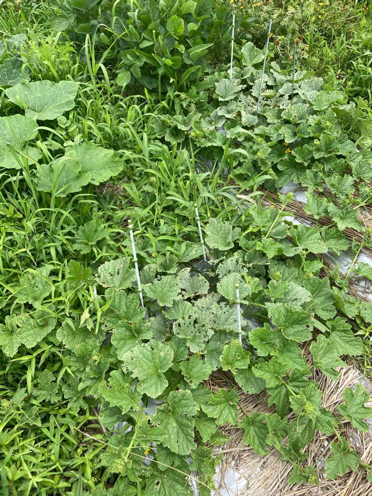 混沌としていますが、網干メロン2株がつるを伸ばしています。雑草を刈らねば…。