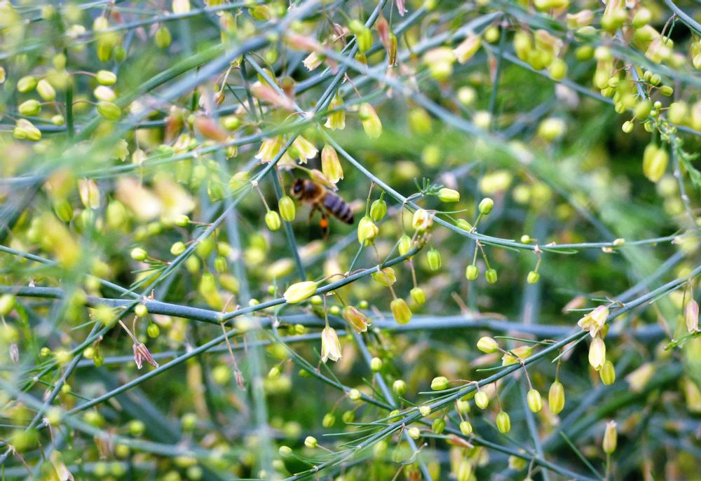 春先 美味しく頂きました アスパラガスが 私の背丈以上になり 花を咲かせています 秋には沢山の 赤い実を つけるでしょう