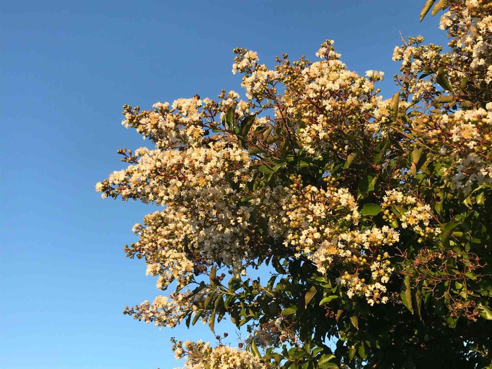 日の出直後の朝日に照らされる白いサルスベリ。雲一つない青空の青が深い。