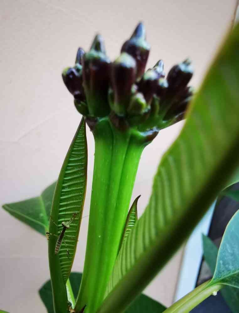 やっと付いたプルメリアの花芽付近にカマキリの赤ちゃん😯