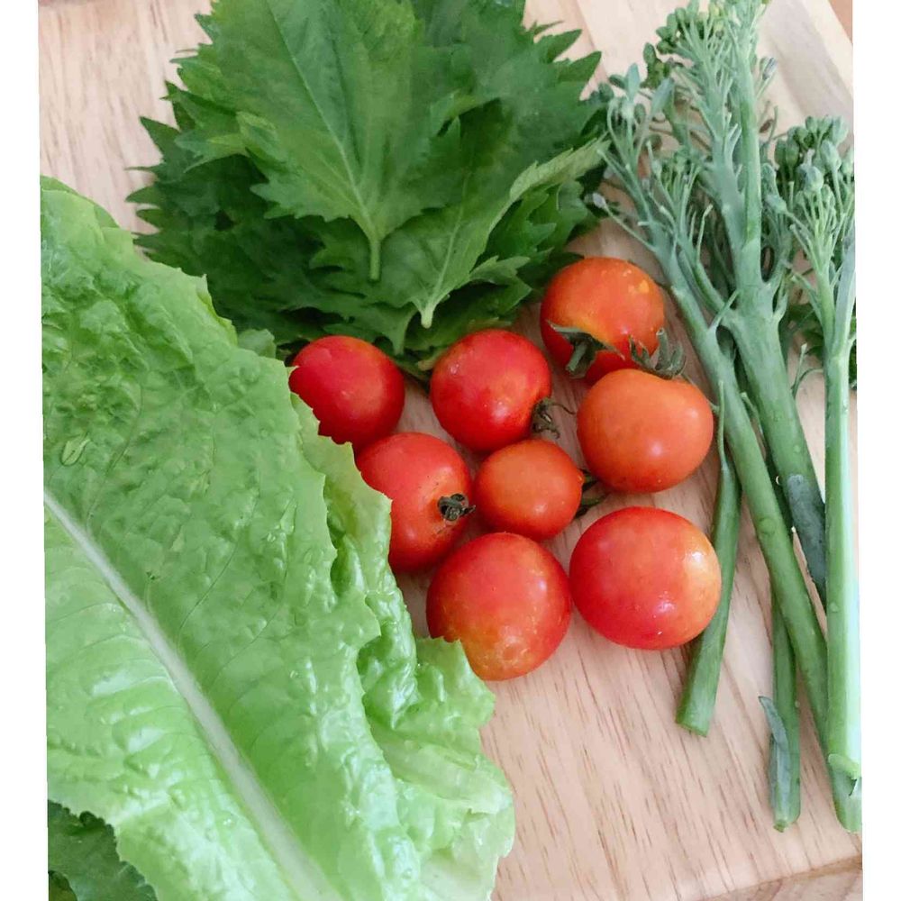 サンチュ、しそ、ミニトマト、スティックブロッコリー