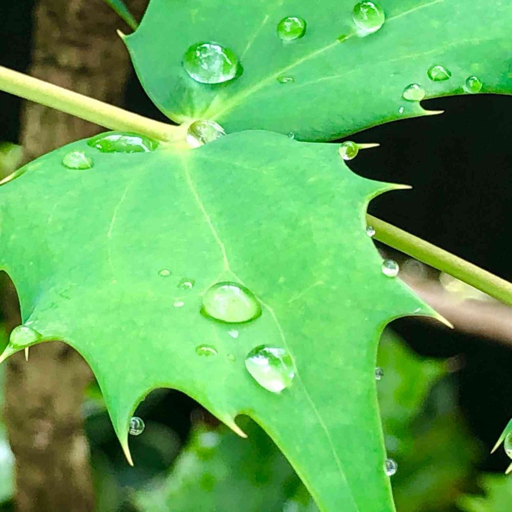 ヒイラギの葉の上で追いかけっこしている滴達
