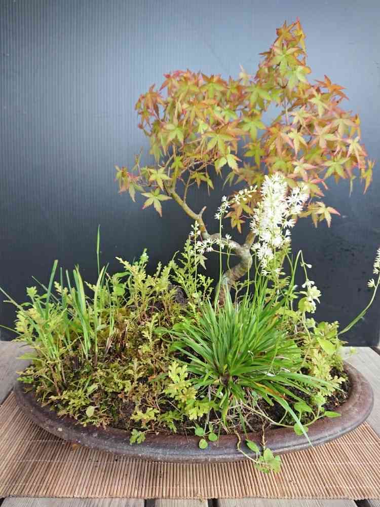 盆栽の寄植えですか?イワゼキショウって言うですね、白いお花 可愛いですね。うちも溶岩苔玉に紅葉を植えていますが、どんな風に枝を切ったらいいのかわからず💦💦紅葉、参考にさせてもらいますね😊