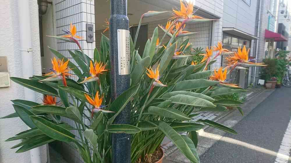 仕事帰りにかき氷屋さんのある商店街のメインストリートに咲き誇るストレチア✨