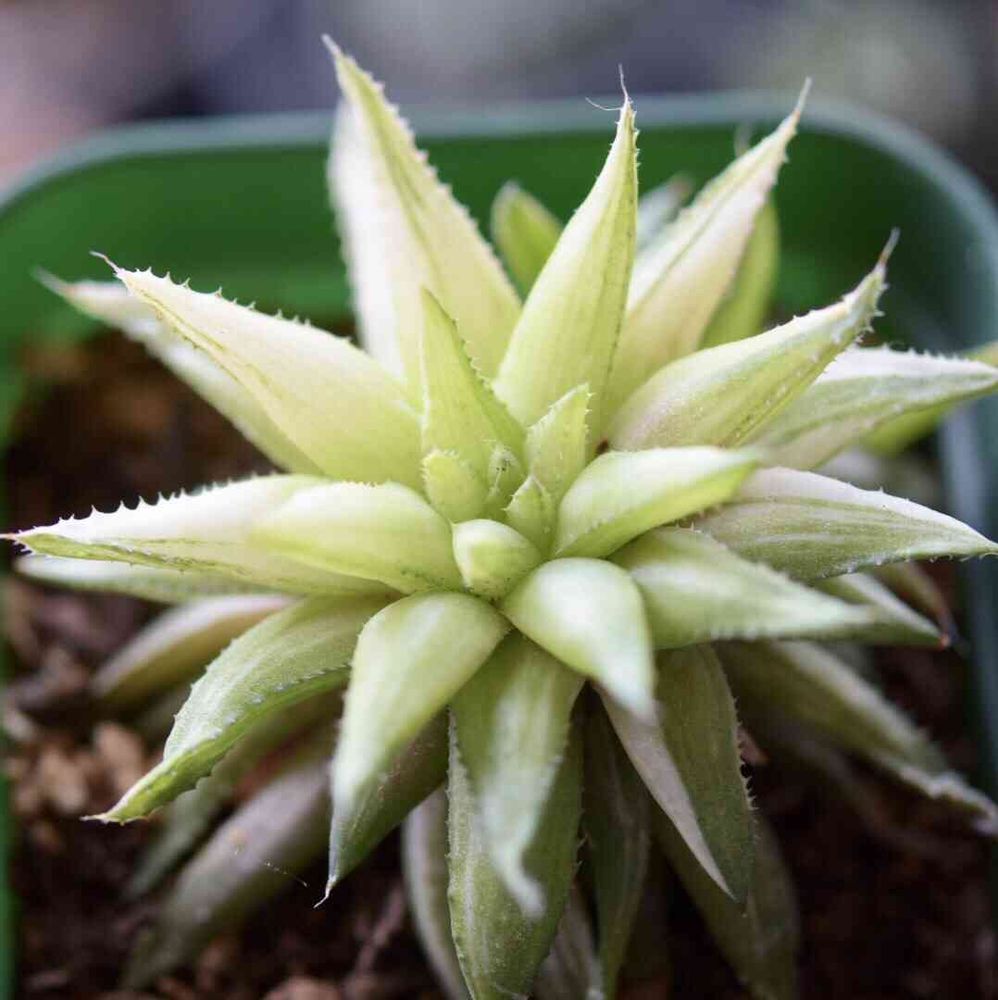 買った時はお日様当たりすぎていたのか、赤っぽくなっていたけど、半日陰管理で斑も綺麗な白い色になりました。