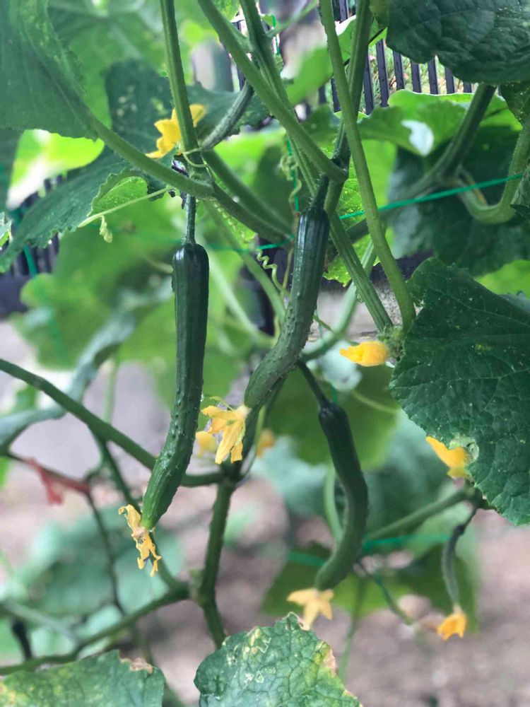 え、えー!昨日見た時は小指程のちびキュウリだったのに今朝見たら10センチ以上に伸びてる〜😳こんなに成長が早いことにびっくり😙