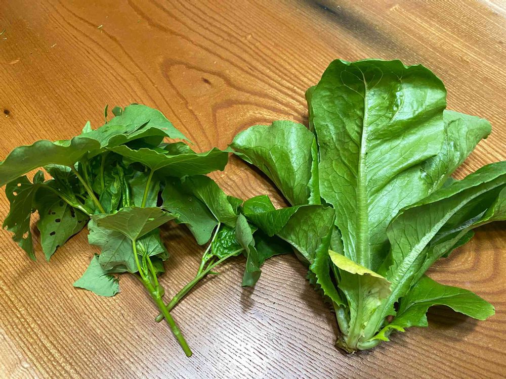 ソバは今年、偶然庭に生えたので、以前、蕎麦屋の突き出しで出たのを思い出して食べてみました。意外といけます。ロメインレタスはうちの定番です。
