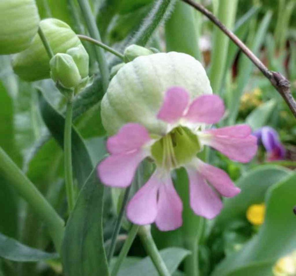 シレネ・ブルガリス「ハッピーモモコ」です😊この子ももう何年もいついてくれている宿根草です。ブラダーキャンピオン、シラタマソウ、などの別名のあるシレネ・ブルガリスは、普通は白花ですが、ハッピーモモコはピンクで、可愛らしいお花が咲きます(*^^*)地味といえば地味ですが、まーるい袋状のガク片もパフスリーブのようで愛らしく、とてもお気に入りの品種です😁