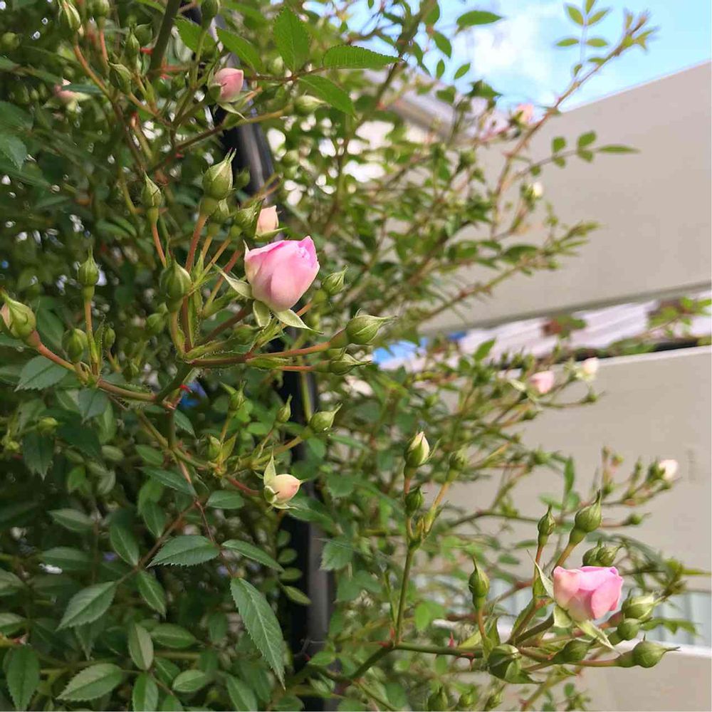 ミニバラがいっぱい蕾をつけピンクの顔を出し始めました😃