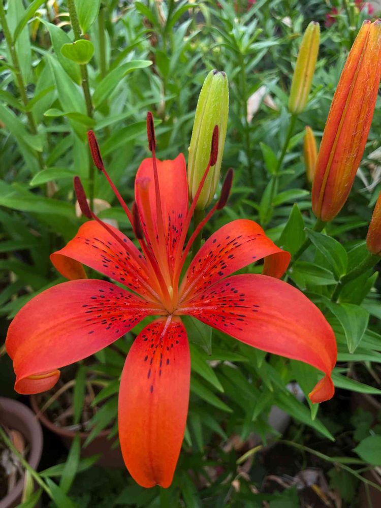 ユリ第6弾、前のオレンジ色のユリとはちょっと違うやつです。花の中心に黒い斑点があります。