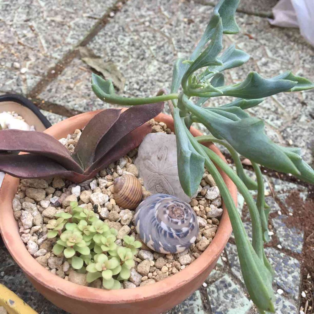 それだけだとイマイチ可愛くない臥牛やマサイも、貝殻を乗せると可愛く見える不思議。鉢にペイントしてBEACHってかけば、すっかり某ショップで4,500円な感じに。やらないけどね。