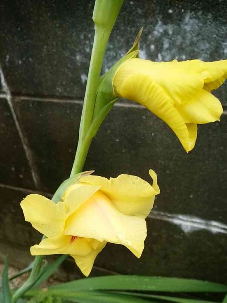 庭のグラジオラスの黄色が開花しだしました、少し近所より遅いかな