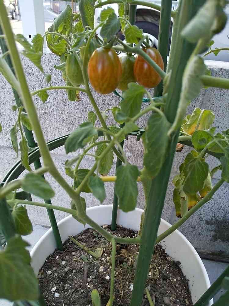 ミニトマト63日目。ここ連日続く雨の影響もあり、軒下に避難させていて日光に十分当たっていなかったけど、晴れた日を狙って出すと、ようやく赤く色づき始めました。まだ一番果房です
