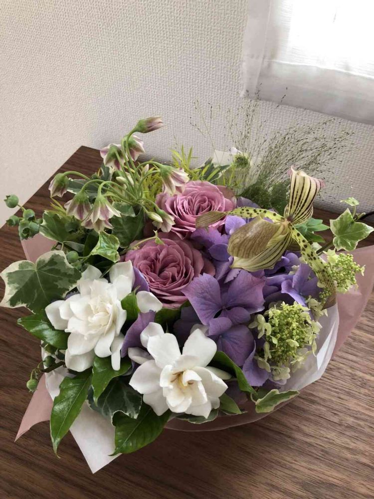 クチナシ、バラ、紫陽花、蘭のアレンジメント🤍