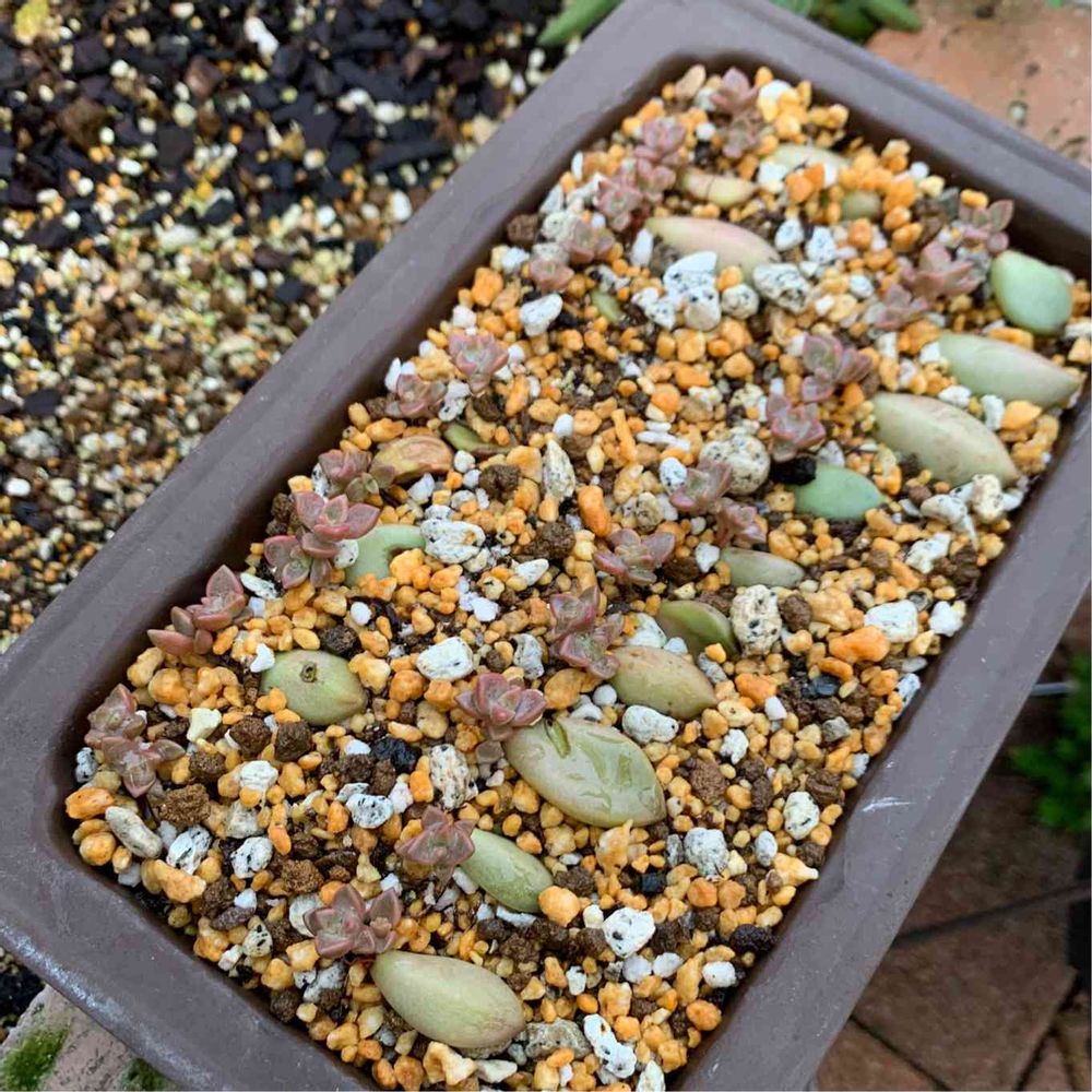 大暴れだったブロンズ姫を解体して植え直し、外した葉は捨てられずトレイに入れといたら根がボーボーで芽も出てきたから並べて植えました😄‼︎