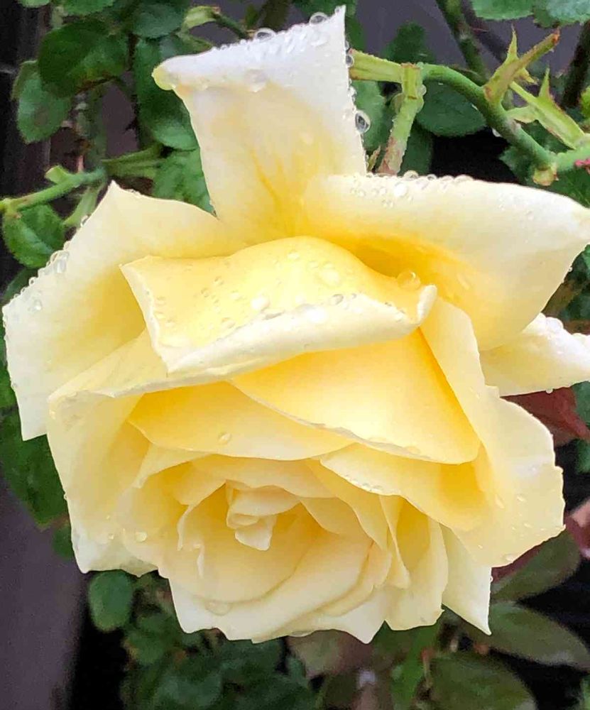 天津乙女さん、クリーム色に近い黄色が雨に濡れて瑞々しく咲いていますね。