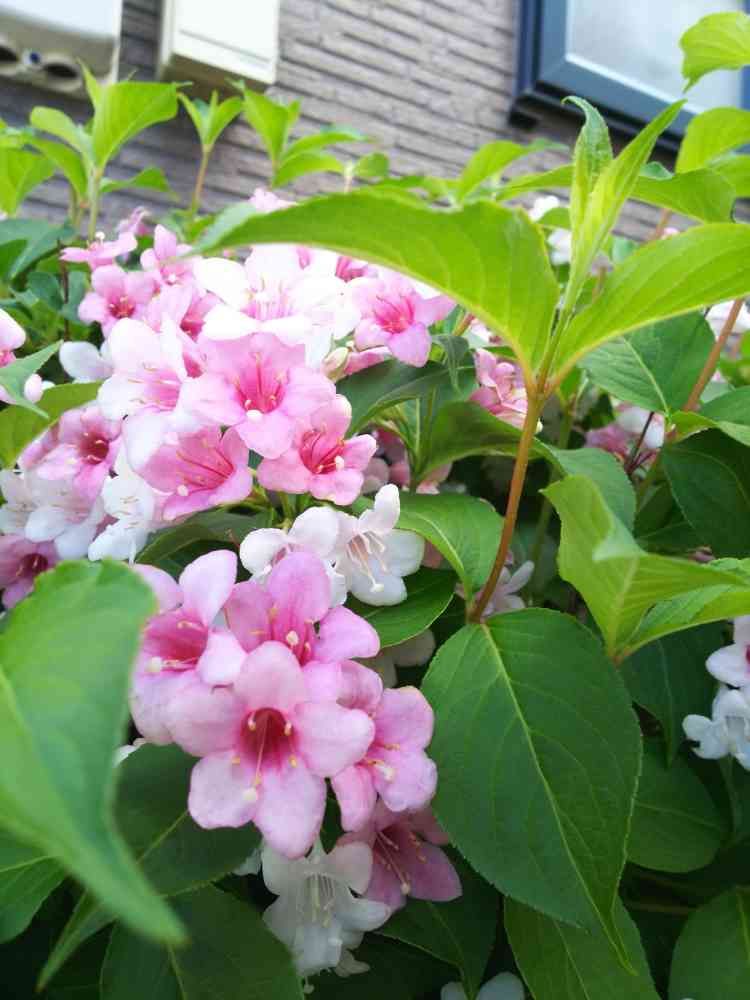 近所の庭先に咲く、オオベニウツギの花。