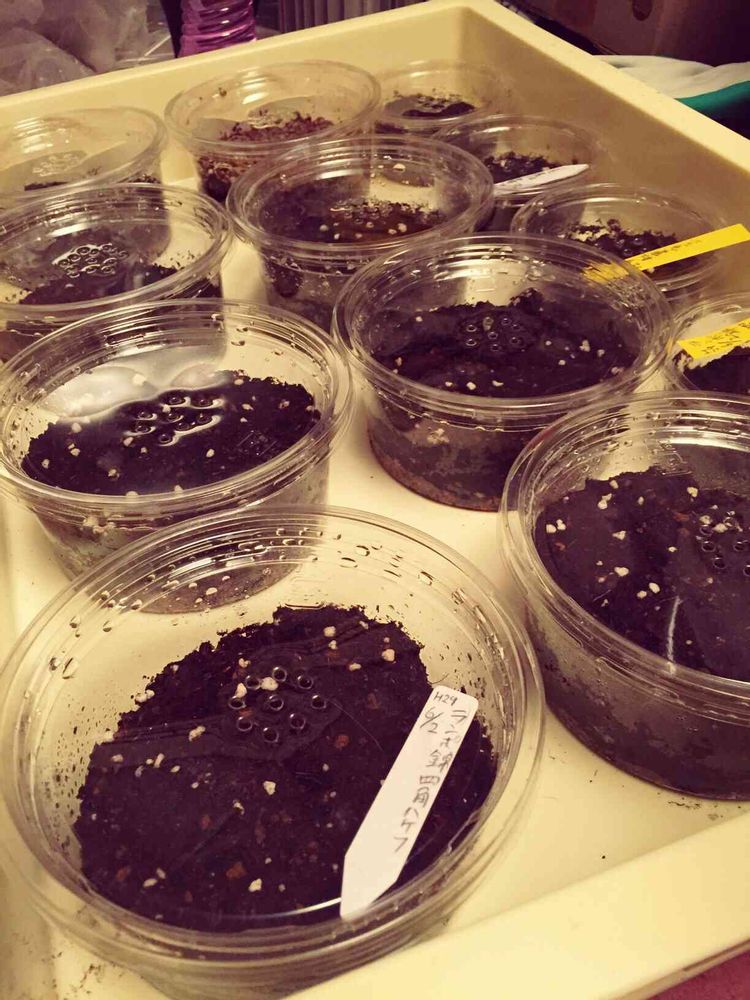 深夜の種蒔き。今回は購入種子のランポー錦と亀甲兜を蒔いてみました。使用用土は市販の播種用土と桐生砂。はてさてどうなるものか。。