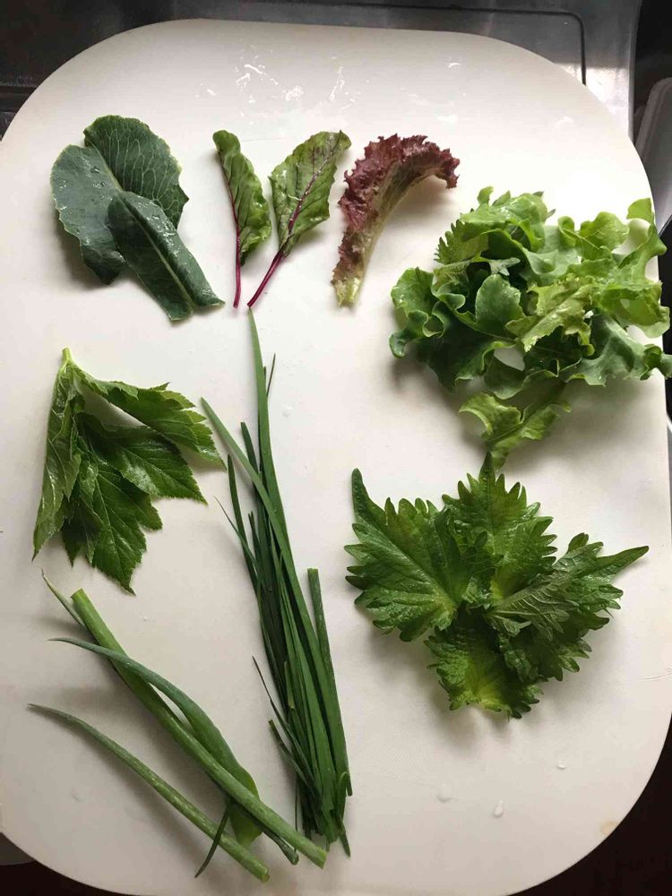 庭の4種のレタスとシソ・明日葉・ニラ・葉ネギで毎朝スムージー。