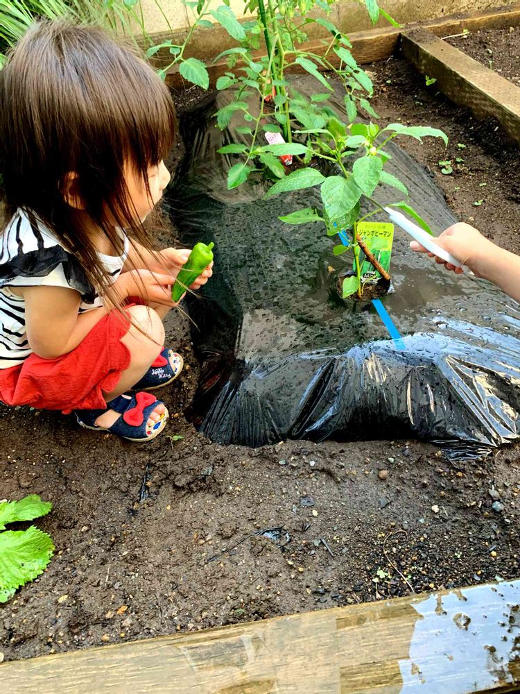 今朝は、ジャンボピーマンの一番果をチビっこたちに収穫してもらいました♡