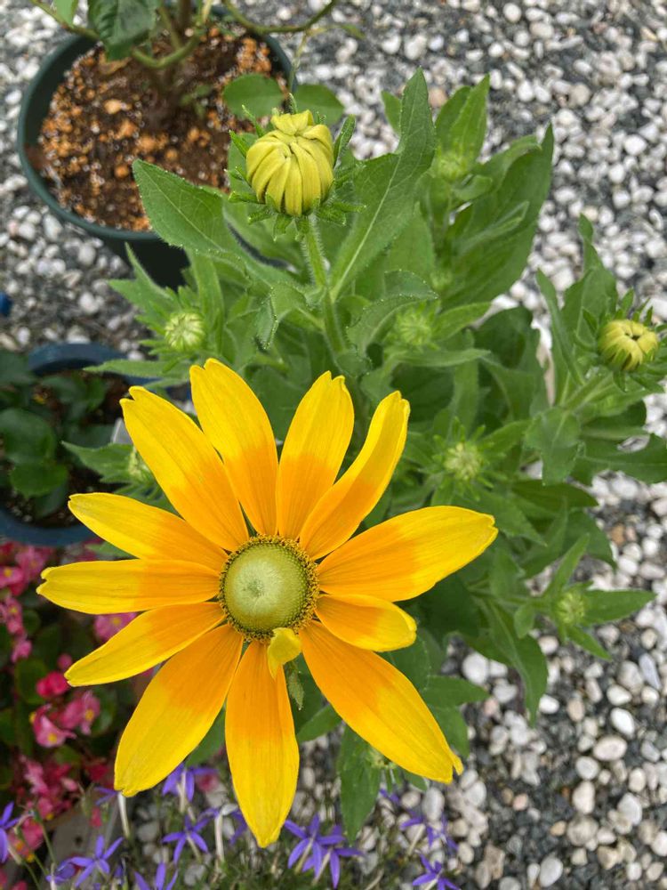 こんにちは、ルドベキア冬を超えて咲いて来ました🌼鉢の端っこに寄ってる😣ビタミンカラーで元気貰います💪