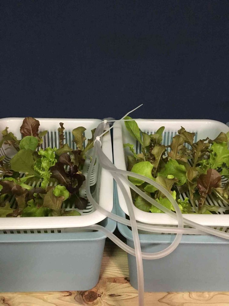 旦那自作100均水切りカゴで水耕栽培の途中経過です。何とか無事なようです(^^)