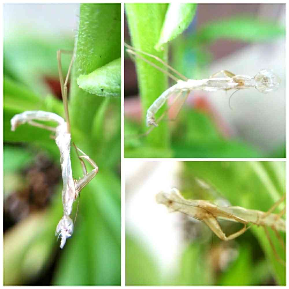 先週からヘリクリサムに赤ちゃんが2匹、居場所を争っていました。この脱け殻は大きいほうの赤ちゃんのもの。
