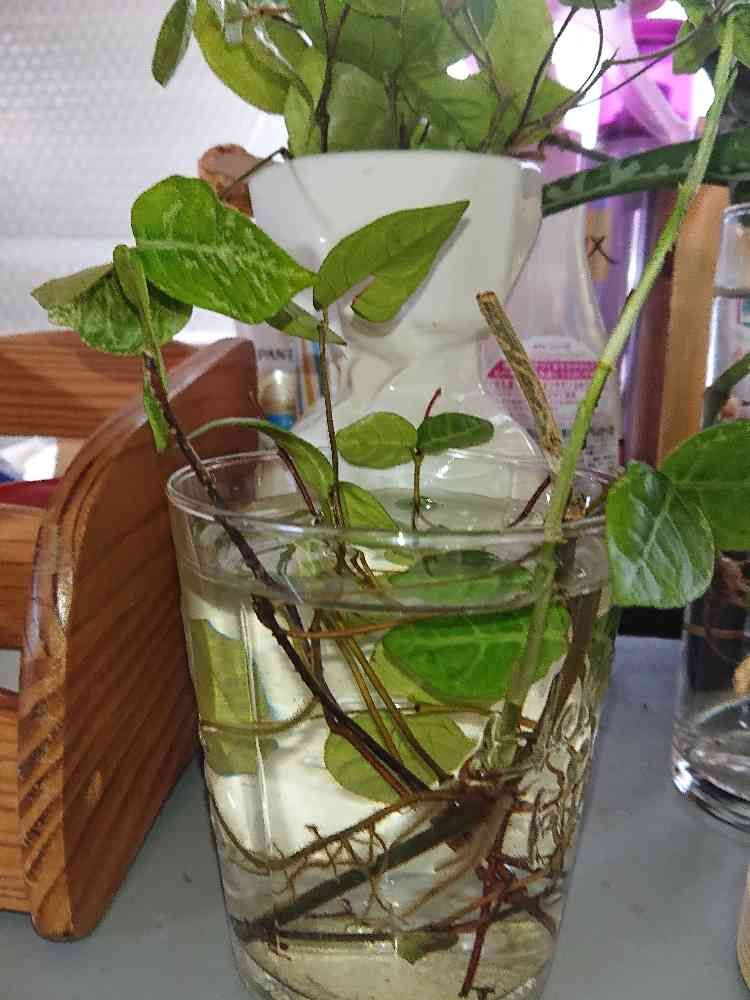 先日の初雪カズラ可愛い根っこが、出て来ました。後ろの花瓶にももう少し頑張って貰います‼️