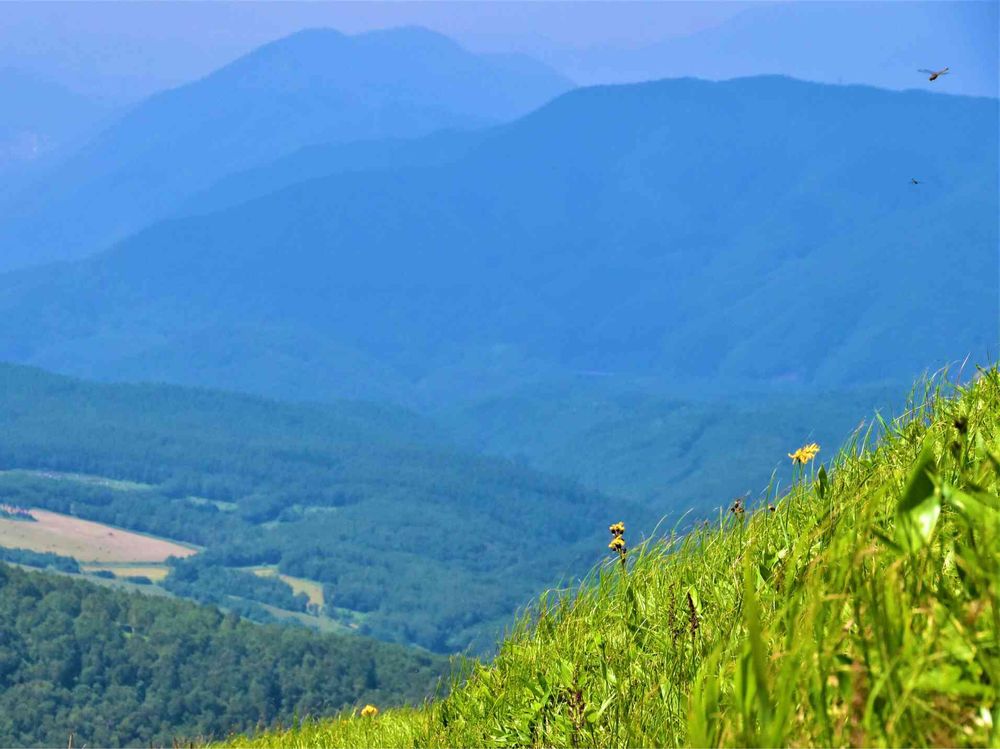 斜面に座り込んで、吹き上げる気持ち良い風を胸いっぱいに吸い込んで…💚💙トンボとラルバダケブキが一緒😍😆