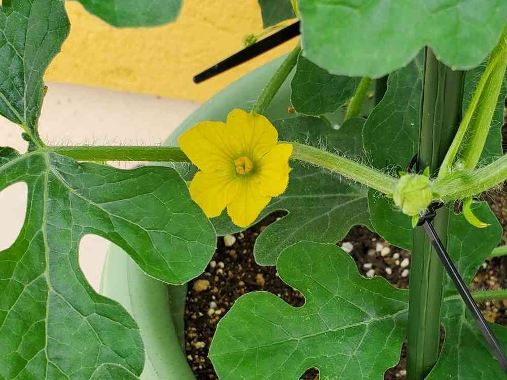 小さなスイカの花が咲いています。盛夏にはグリーンカーテンの中に可愛い小玉スイカがぶら下がっているのが見られそうです...(^_^);。