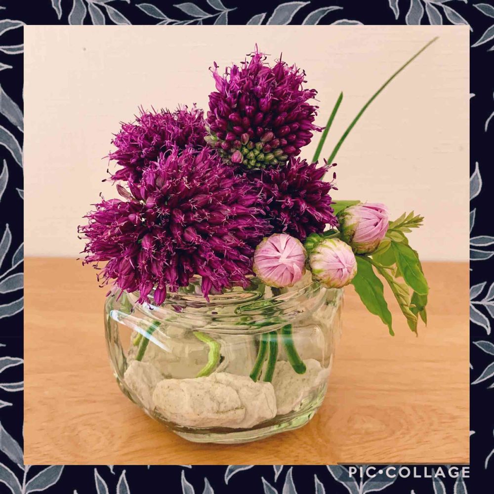 海苔のから瓶に白い小石を入れて、花器にしました🌿小菊のつぼみを使い、可愛らしく仕上げました。アリウムの茎も右上の流れに使いました😊
