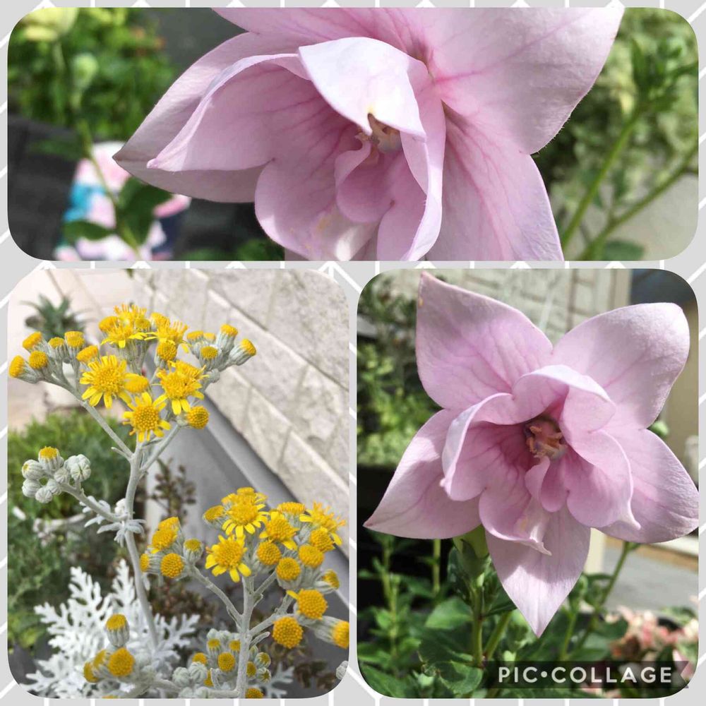 ピンクキキョウとシロタエ菊が咲きました🌼
