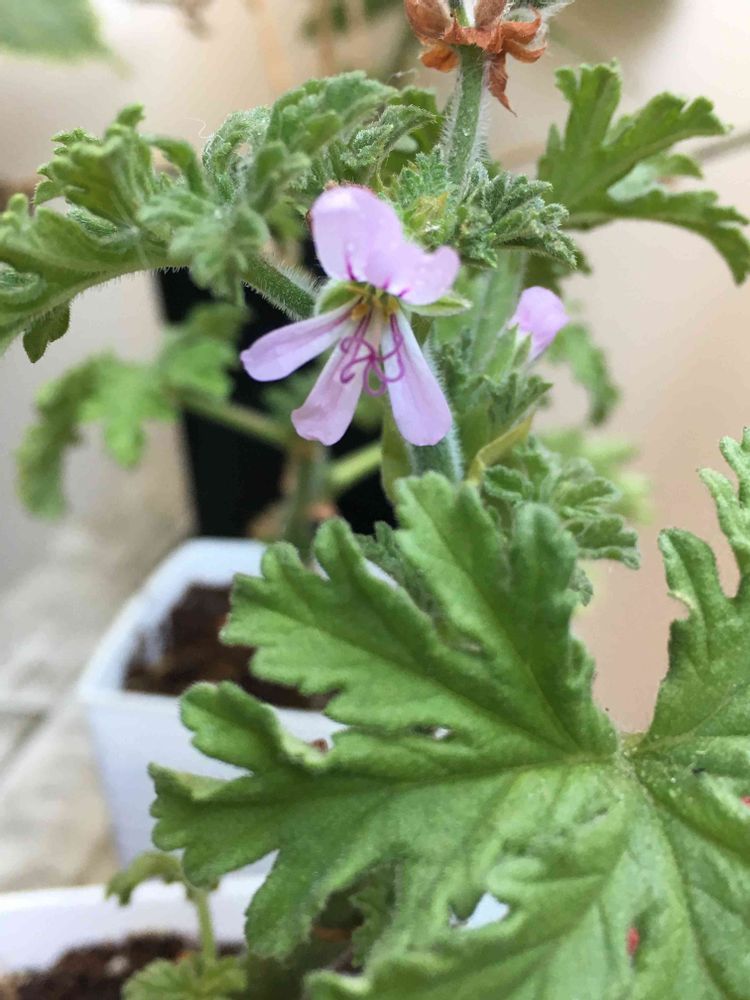 切り花として購入したローズゼラニウムを鉢植えにして様子をみていたら薄紫色の小さな花が咲いていました♪
