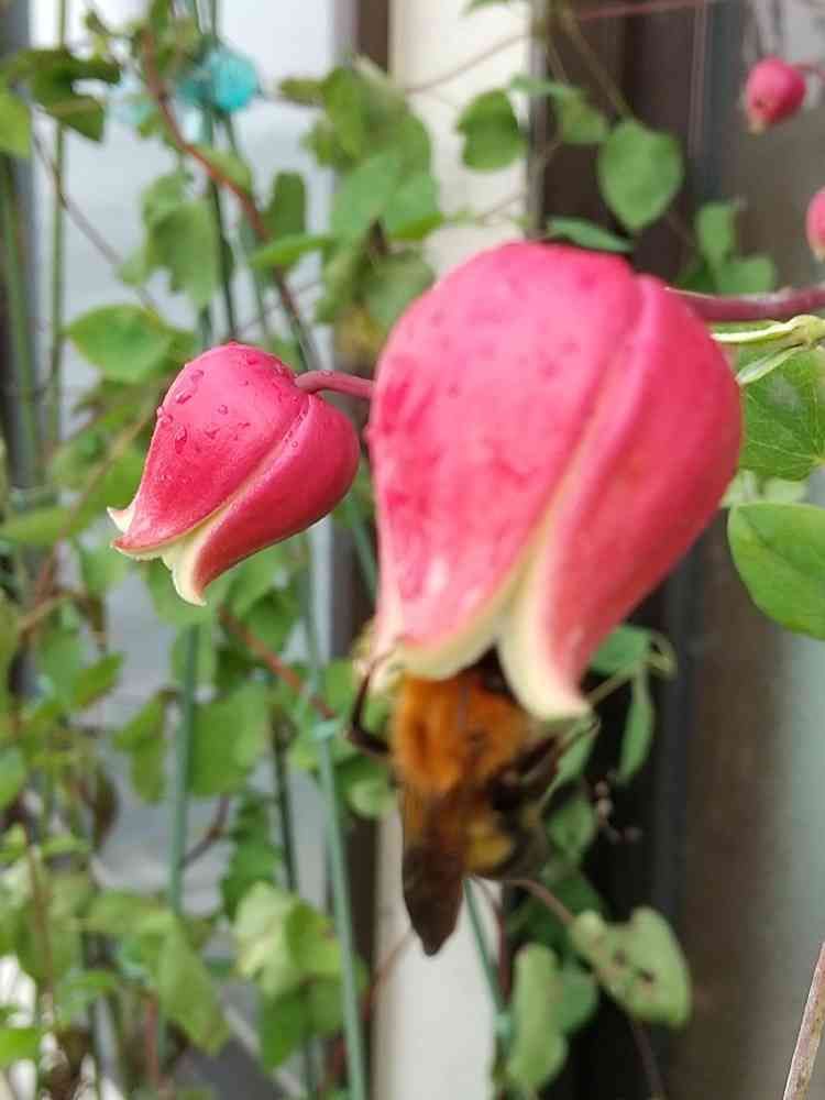 蜂さんが壺クレマチスのお口に入り込み、蜜を吸いまくり〜🐝