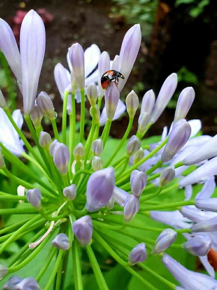 ゆらゆら揺れるアガパンサスにテントウムシがしがみついています。先端まで来たのに飛ぶに飛べないって焦ってるんでしょうか🤭