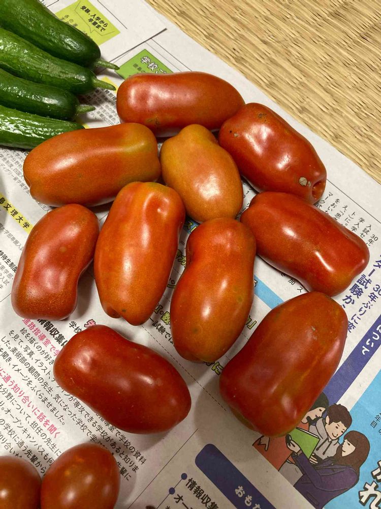 調理用トマトのサンマルツァーノも初収穫。トマトソースにするにはまだ少ないでしょうか。