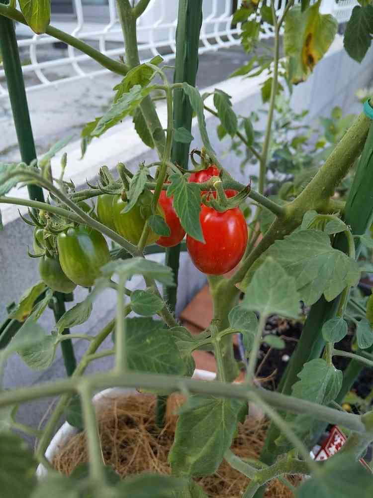 ミニトマト(純あま)66日目。とりあえず3つだけ真っ赤になったのですが第一果房が全部赤くなるまでは収穫しない方がいいのかしら🤔