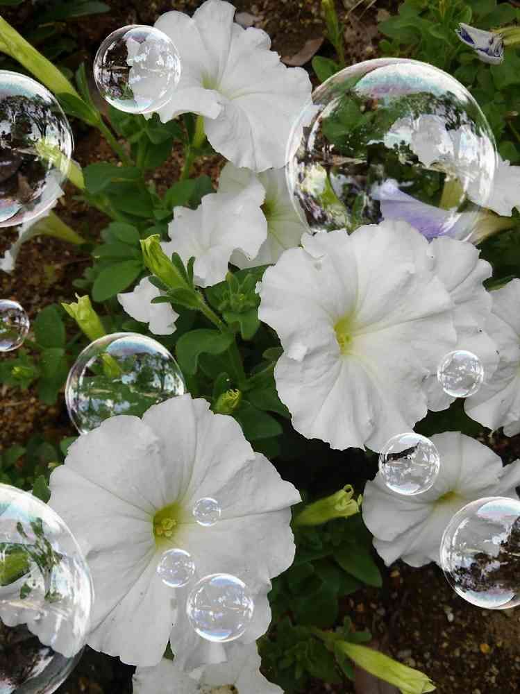 ペチュニアとシャボン玉のコラボが素敵です~(๑´ω`๑)♡キュン
