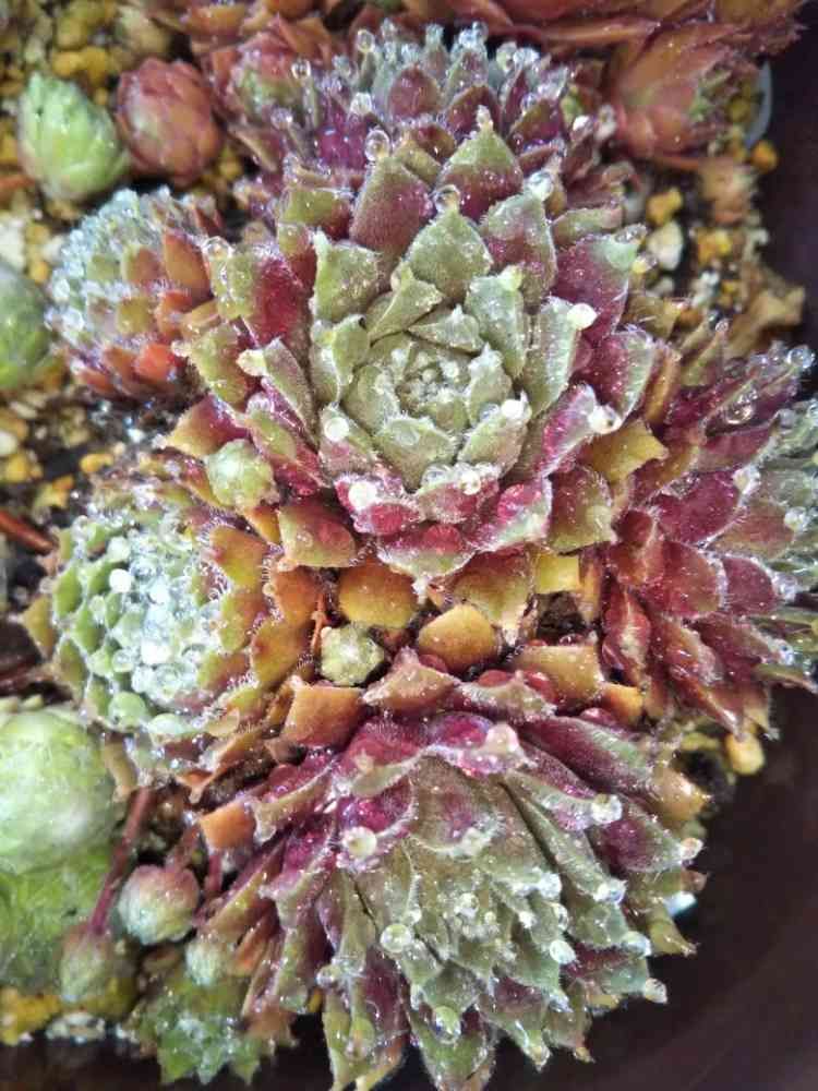センペルビウム・大紅巻絹さんの雨粒が綺羅綺羅の朝😊