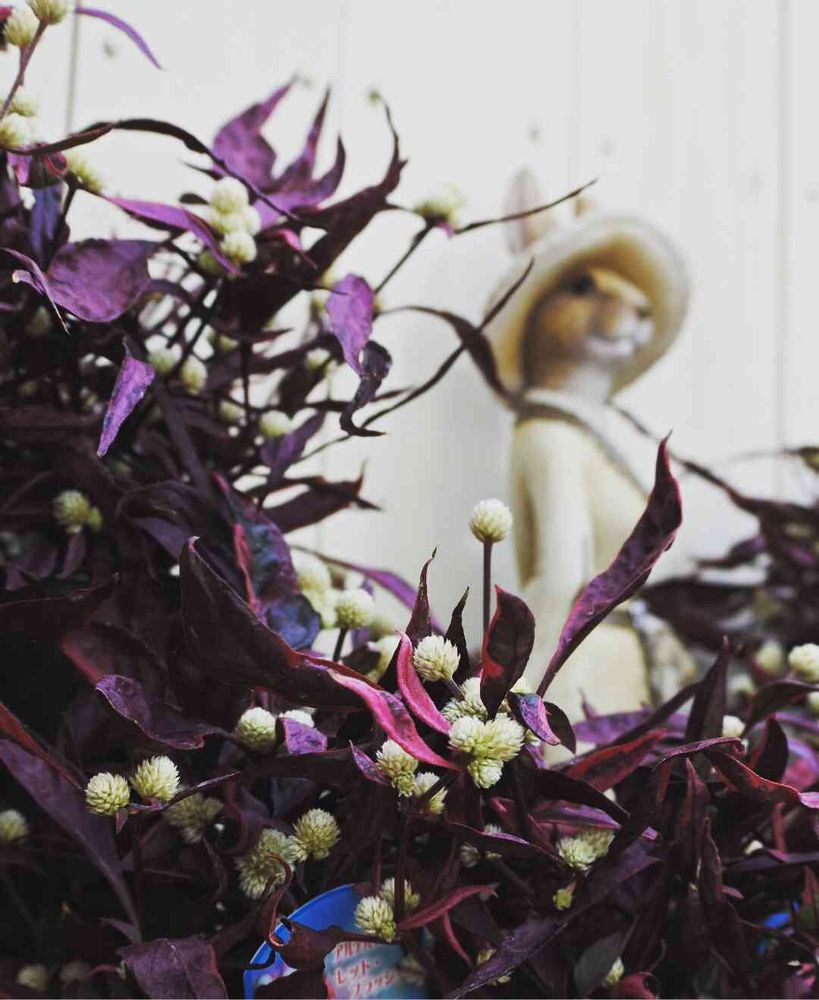 綺麗な紫(赤)色の葉と白のフワフワした花のおしゃれなガーデングリーンです。