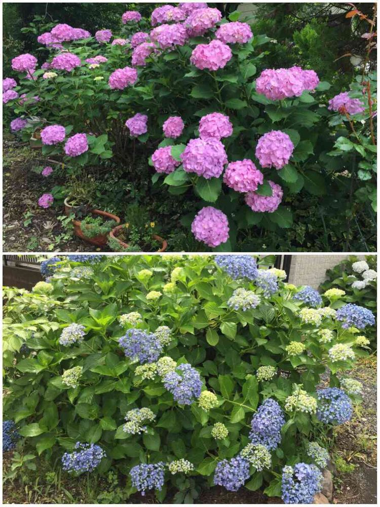 ピンクのアジサイはたぶん亡くなった義父が植えたもので、青いウズアジサイ?は近所の人が引っ越すときにウチの庭に植えてったの(笑)