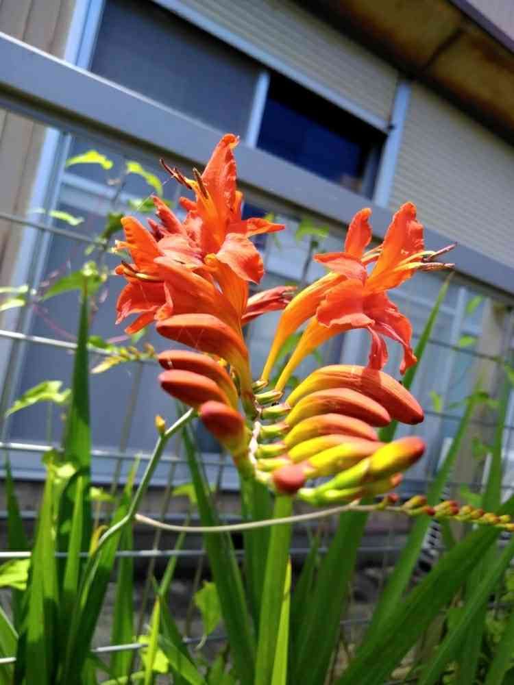 散歩でみかけました、モントブレチア、朱い色がとても綺麗!