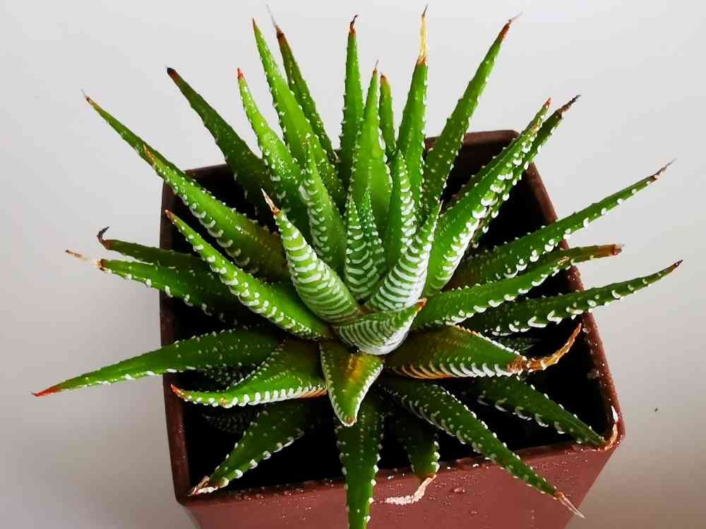 ゼブラ柄で先のとがった硬い葉っぱを放射状に伸ばす、硬葉系ハオルチアです。