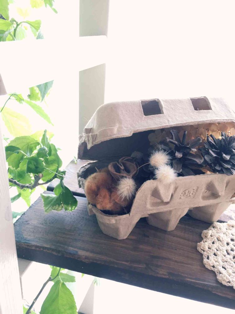 セリアの卵ケース⁇にコットンやら松ぼっくりやらを詰め込んでみました(♡ˊ艸ˋ♡)