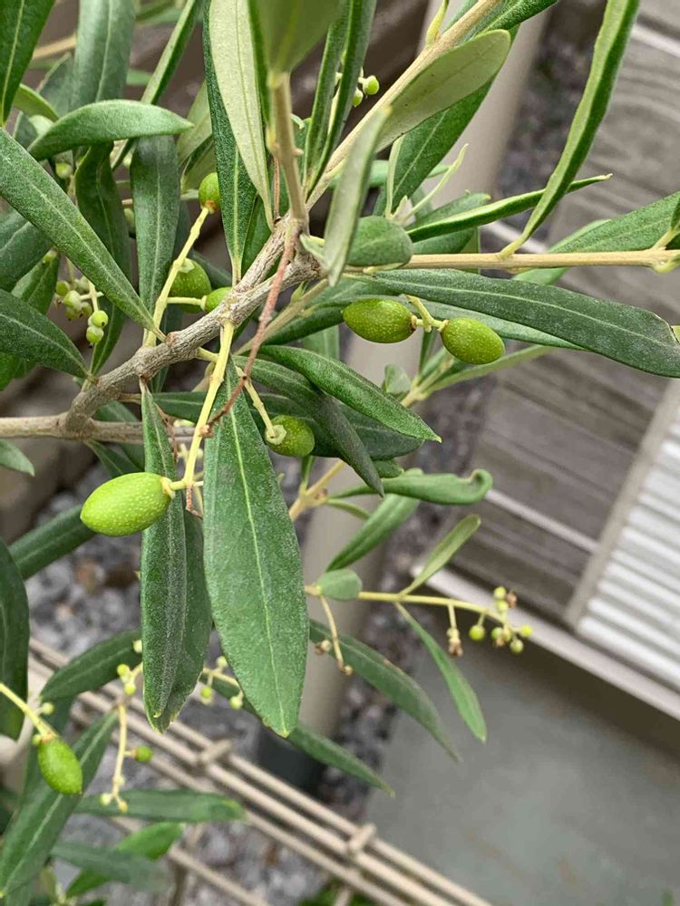 オリーブの木は、つがいでないと実がならないと言われたのに、去年、どこかから風で飛んできたんですかねー2、3個なりました。
