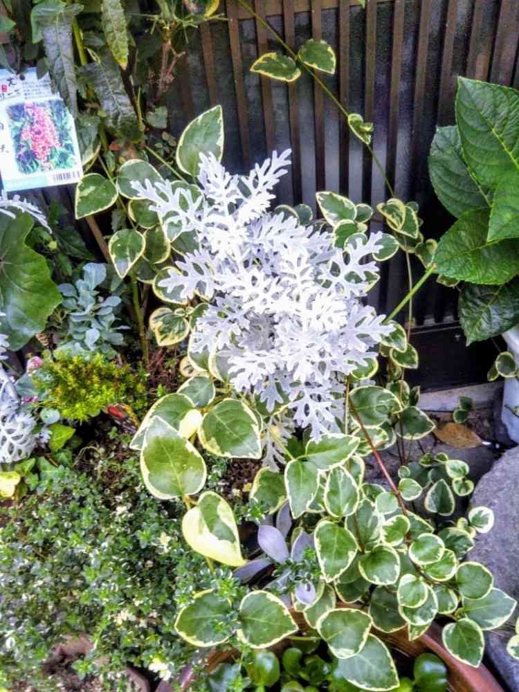 シロタエギクの新葉とグリーンの植物が素敵です💕