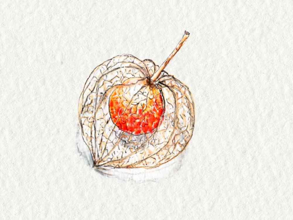 アイコン画像に使用している六角状のガクを虫に食べられたホウズキ