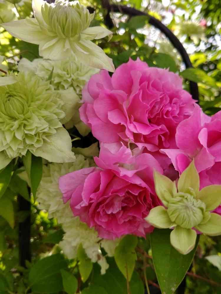 両方ともバラかと見間違う程 素敵なクレマチス💚いい感じです(o^^o)