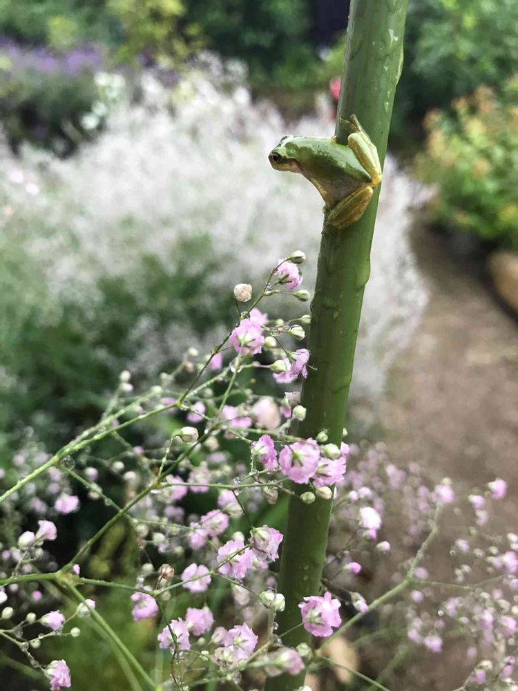カスミソウがモリモリしすぎて、倒れないようにしてあったポールに、カエル🐸さん。