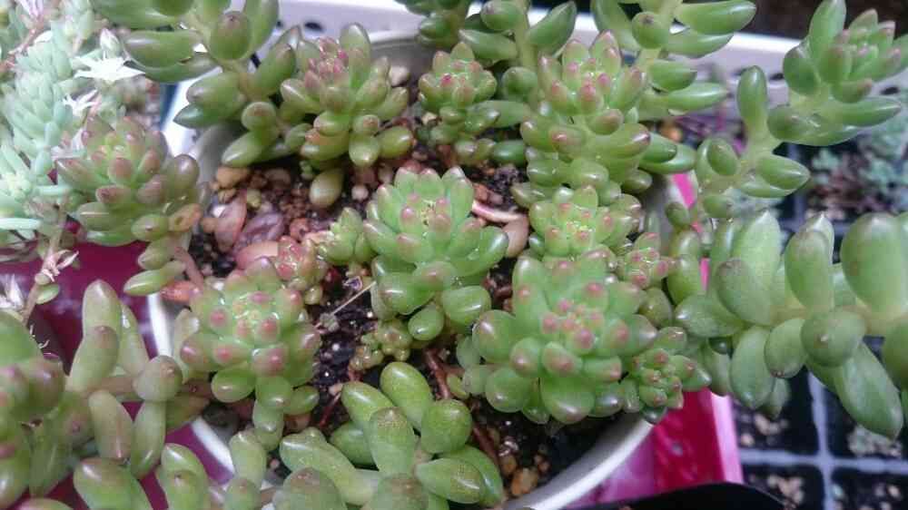 多肉って基本は秋から冬に紅葉するってネットで書いてましたけど、パープルヘイズとか同じ株でも緑と紫のとこに分かれてたり、このホワイトストーンクロプみたいに今?って言うタイミングで色変わったりするからよくわからないですよね(笑)